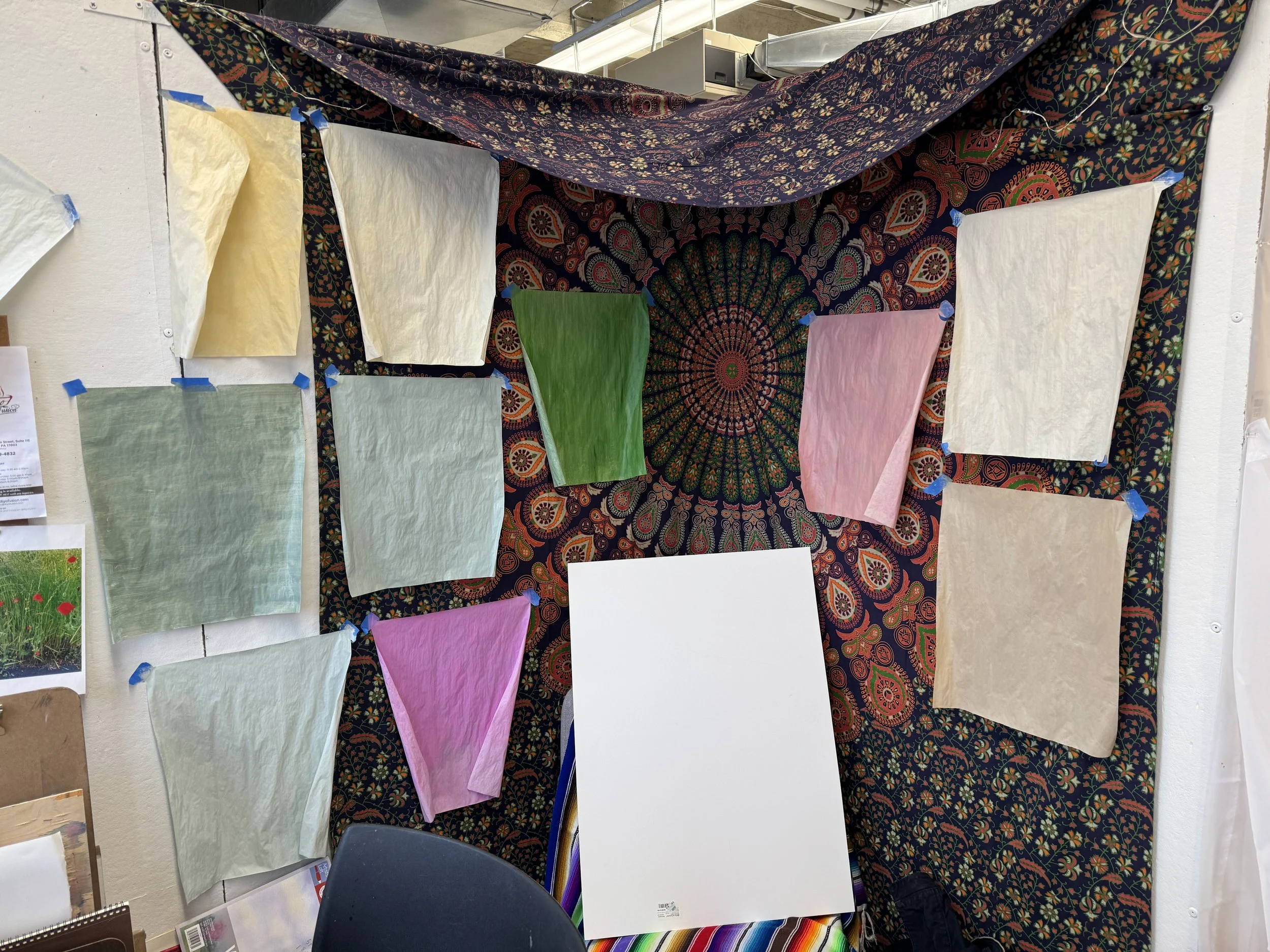 These painted sheets will create smaller studies with torn paper and nori paste, allowing me to explore different textures and compositions. I can’t wait to see how everything comes together. Stay tuned for more updates next week!