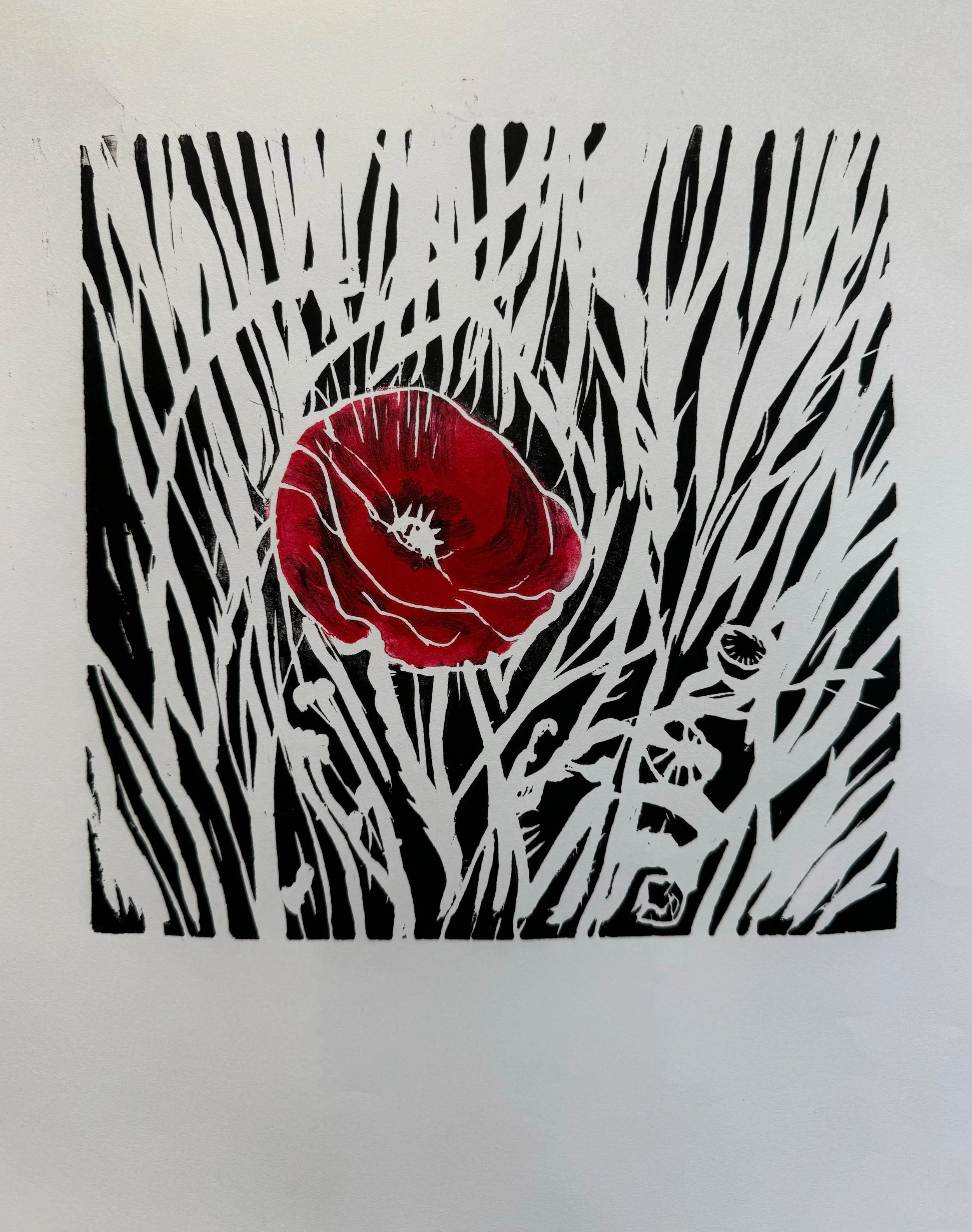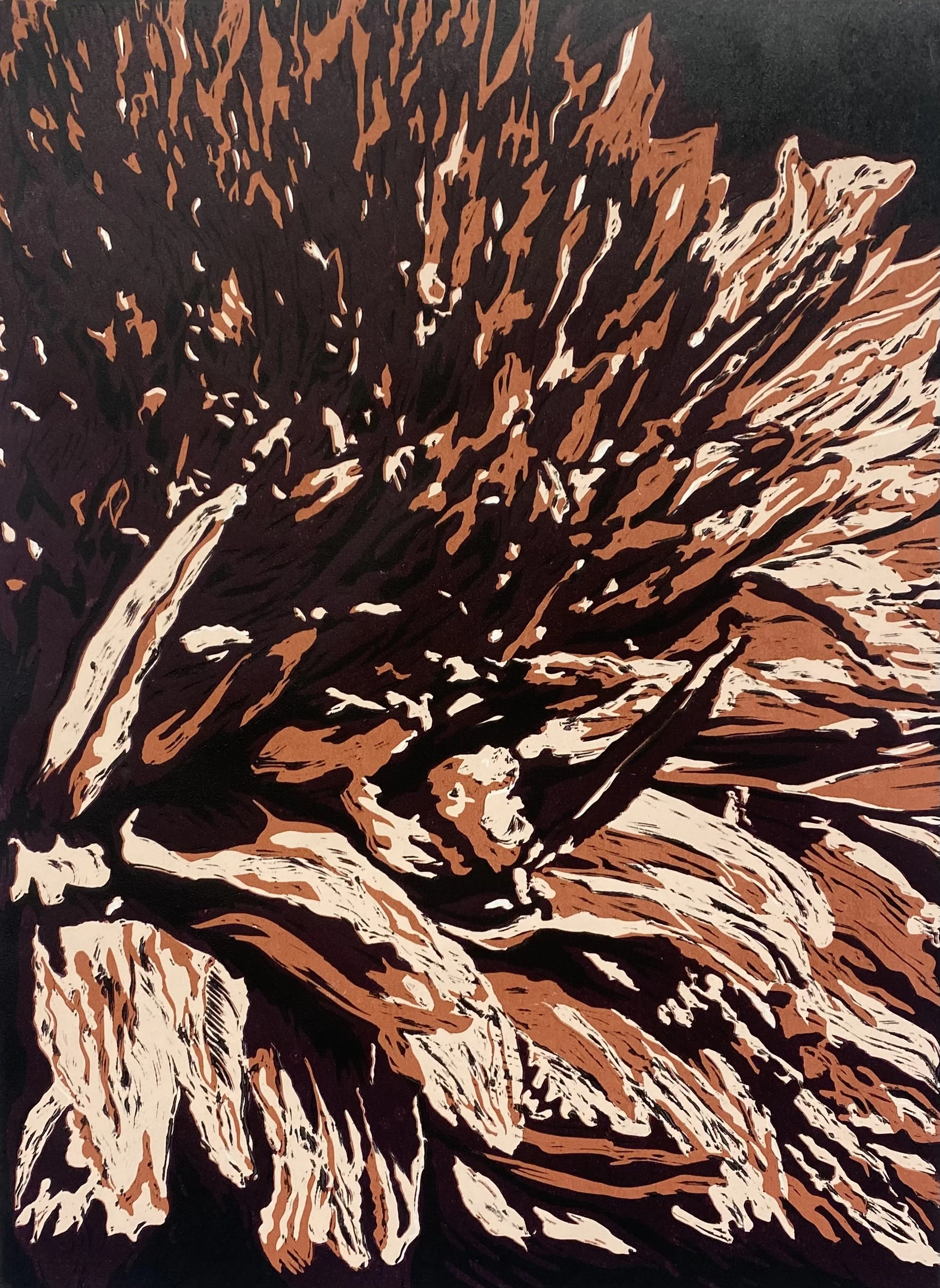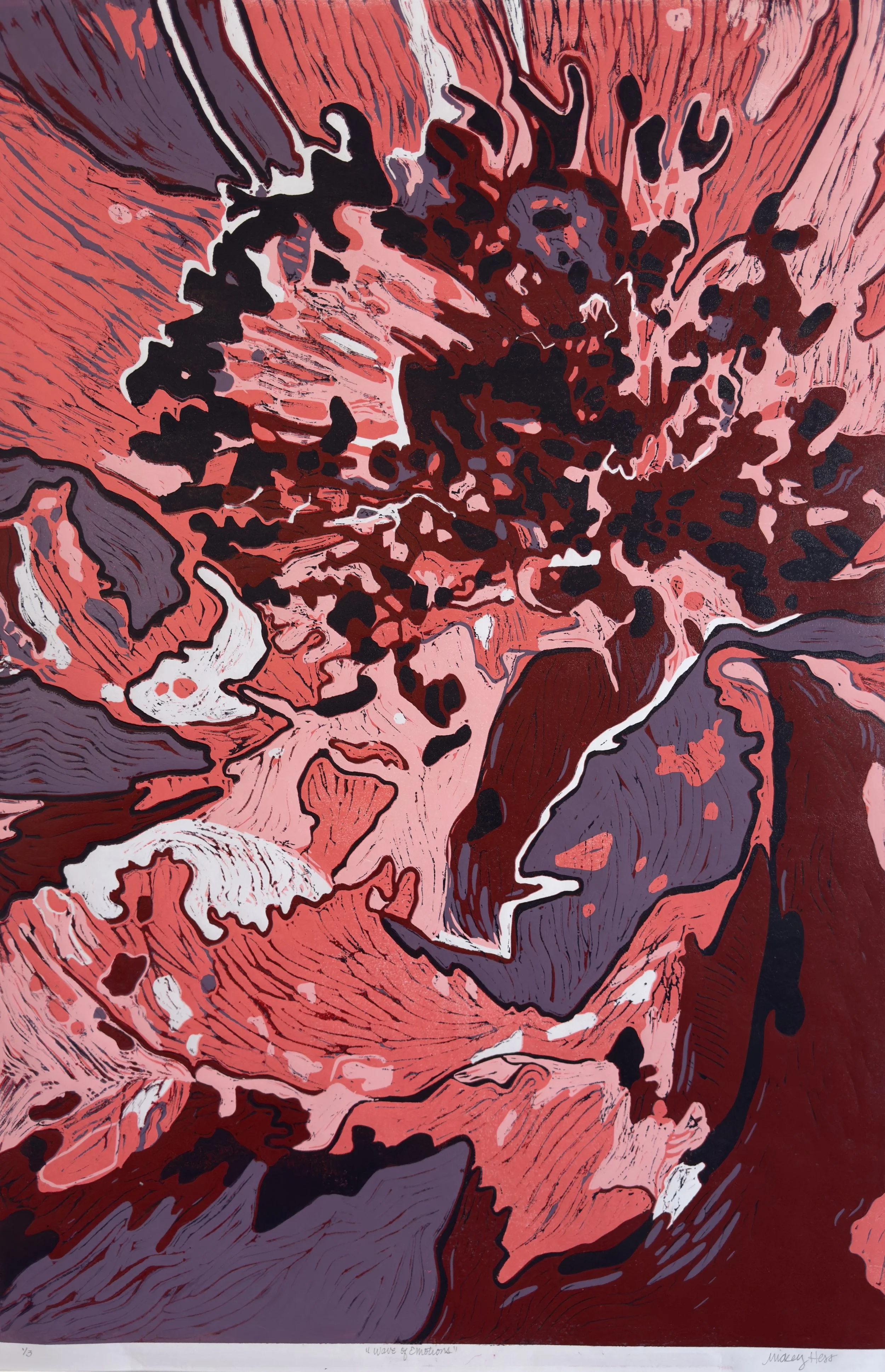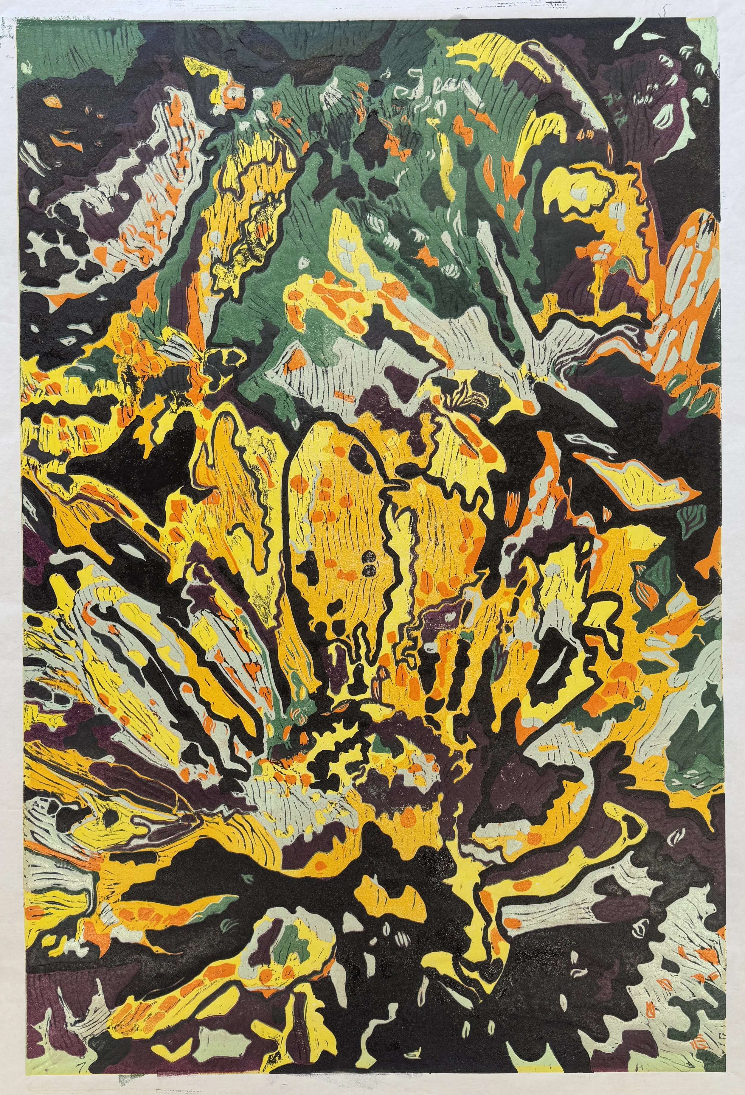 The design suggests organic elements, evoking the essence of natural phenomena like fire or Fall foliage. The swirling patterns are reminiscent of a flame's unpredictable dance or the intricate weave of petals caught in motion. This limited series print employs the technique of four color reductions on linoleum, showcasing the texture that emerges during the carving process. It uniquely explores form and color, inviting viewers to explore its depth and intensity.